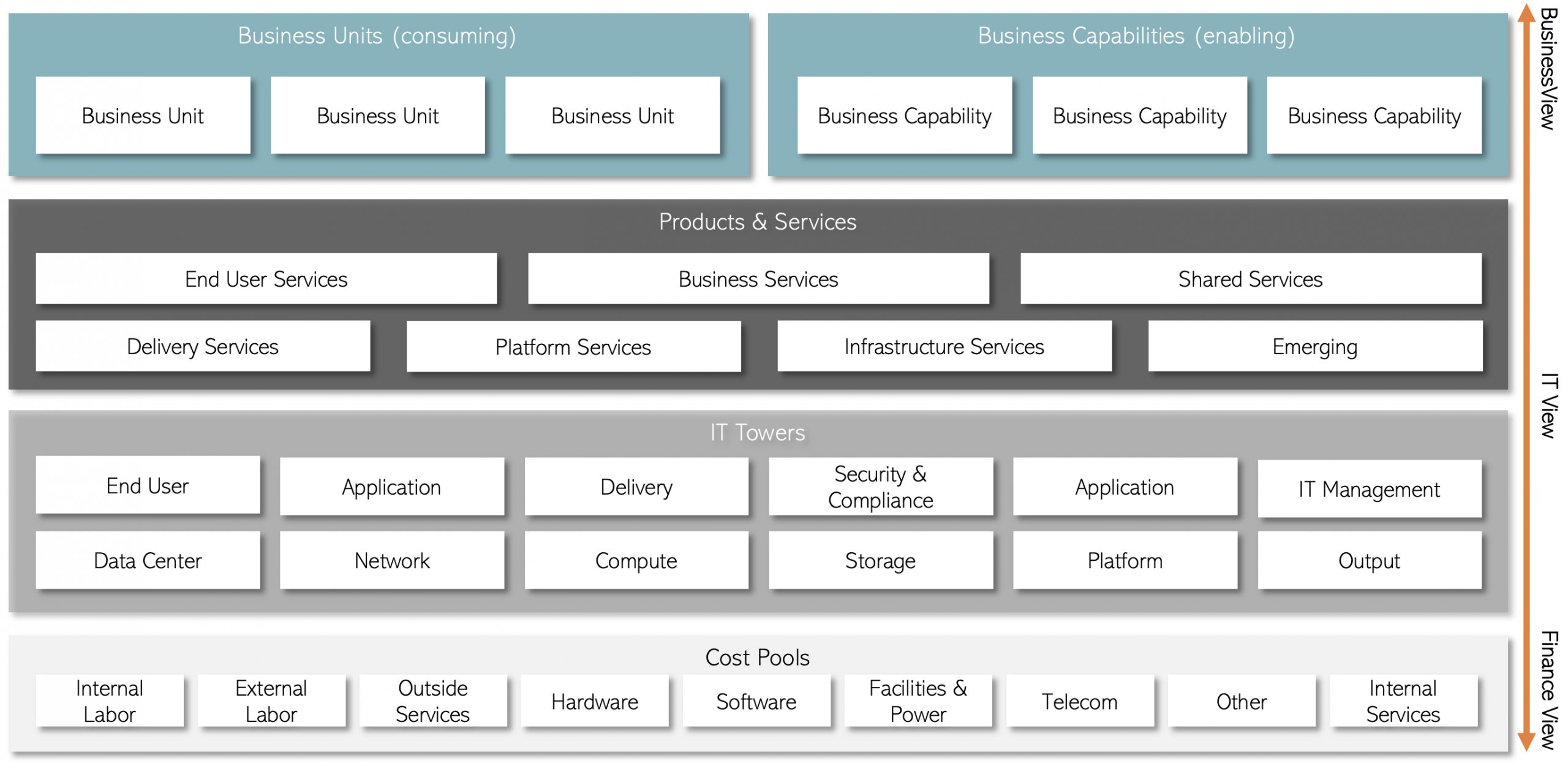 Die IT Towers beinhalten die technischen Services, die gemeinsam die Basis für Produkte oder Kundendienstleistungen bilden. Standardisierung und Wiederverwendung sind entscheidend, um Skaleneffekte zu nutzen. Gleichzeitig ist dies die Ebene mit dem größten Analyseaufwand.